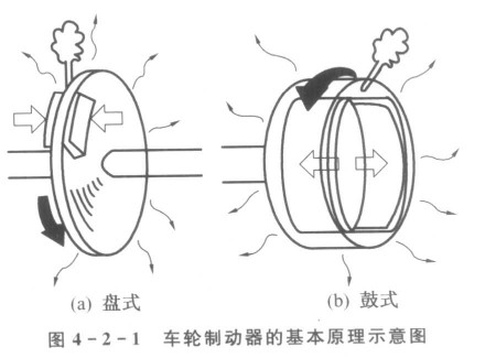 Figure 4 - 2 - 1 shows the usual schematic diagram of drum and disc brakes. When the photo library shoe presses the rotary drum or disc brake, the friction between the contact surface of the friction, by converting kinetic energy into heat energy and automobile, the heat is emitted into the air, the vehicle deceleration and parking.